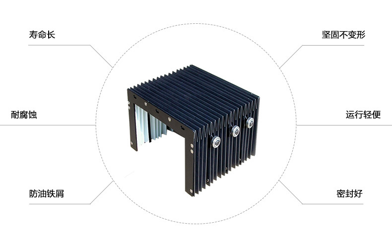 鋼板防護罩具有密封好,能防鐵屑、防冷卻液,防工具的偶然事故。鋼板防護罩裝置優(yōu)點另人贊嘆:護罩每片可連發(fā)同動,完全不同于一般護罩一片接一片拉動式,因此噪音極低。